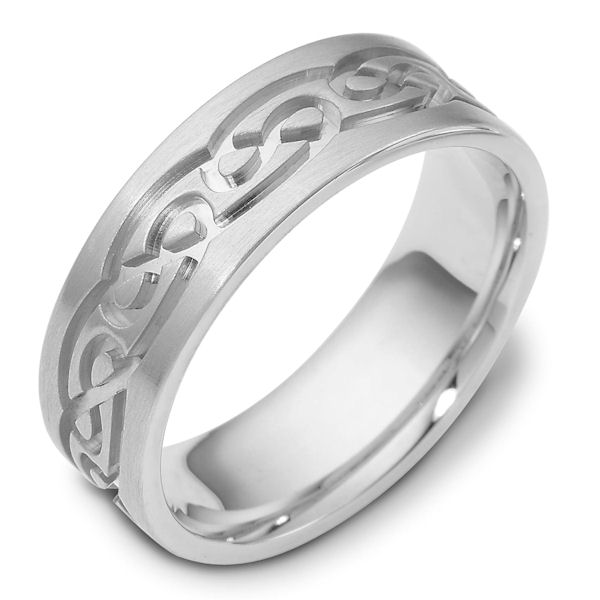 Platinum, 7.0 mm wide, comfort fit, carved with Celtic wedding band. The ring has Celtic carved designs around the ring. It is matte finish. Different finishes may be selected or specified.