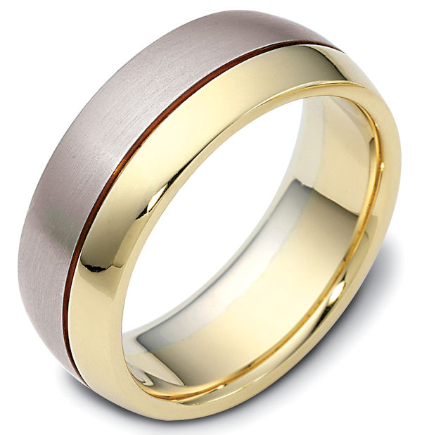 18kt Two-tone gold classic, comfort fit, 8.0mm wide wedding band. One portion of the ring is matte finish and the other is polished. Different finishes may be selected or specified.