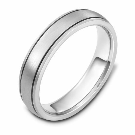 14 kt white gold, hand made comfort fit Wedding Band 5.0 mm wide. The whole ring is a matte finish. Different finishes may be selected or specified.