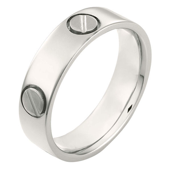 14 kt White Gold hand made comfort fit Wedding Band 6.0 mm wide. The ring has fasteners that resembles screws. These are around the whole ring. The ring has a matte finish. Different finishes may be selected or specified.