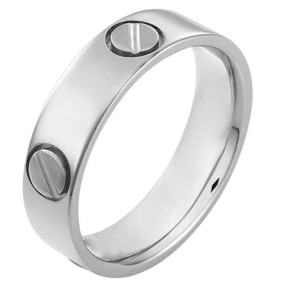 Platinum hand made comfort fit Wedding Band 6.0 mm wide. The ring has fasteners that resembles screws. These are around the whole ring. The ring has a matte finish. Different finishes may be selected or specified.