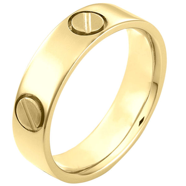 18 kt yellow Gold hand made comfort fit Wedding Band 6.0 mm wide. The ring has fasteners that resembles screws. These are around the whole ring. The ring has a matte finish. Different finishes may be selected or specified.