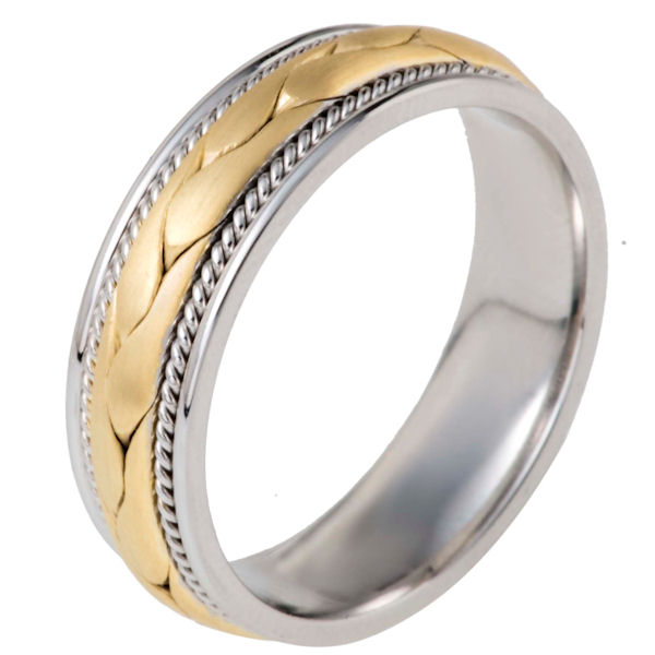 14 kt two-tone hand made comfort fit Wedding Band 6.5 mm wide. There is a hand made braid in the center with one hand crafted rope on each side of the braid. The center is matte finish and the outer edges are polished. Different finishes may be selected or specified.