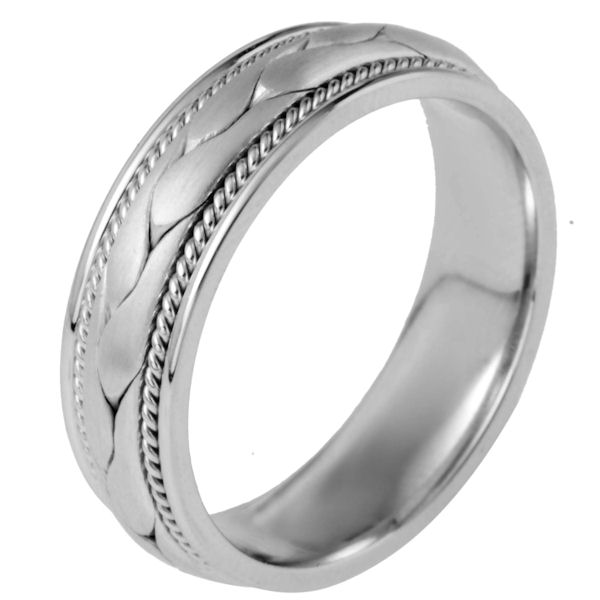 18 kt white gold, hand made comfort fit Wedding Band 6.5 mm wide. There is a hand made braid in the center with one hand crafted rope on each side of the braid. The center is matte finish and the outer edges are polished. Different finishes may be selected or specified.