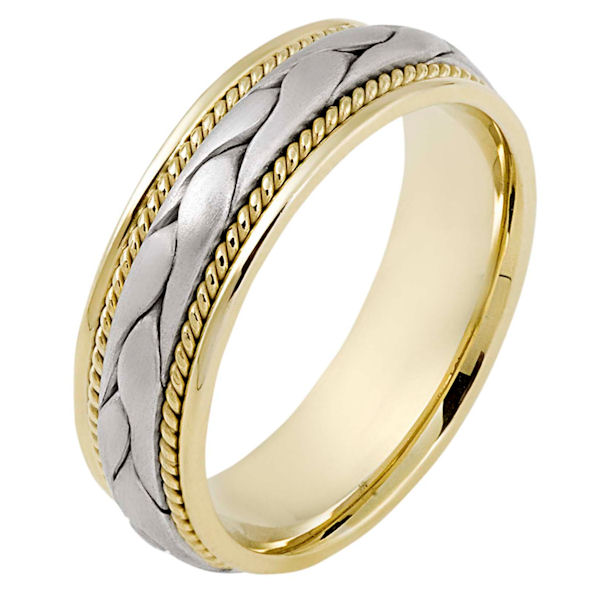 14 kt hand made comfort fit Wedding Band 6.5 mm wide. There is a hand made braid in the center with one hand crafted rope on each side of the braid. The center is matte finish and the outer edges are polished. Different finishes may be selected or specified.