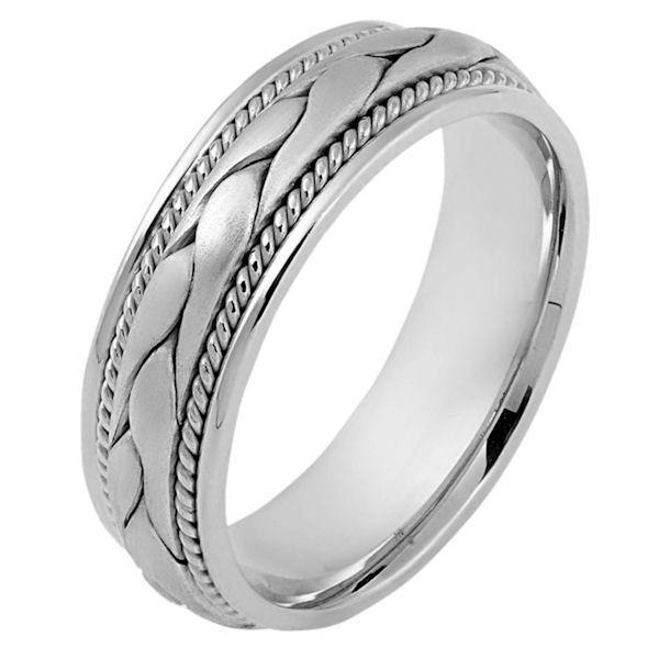 Platinum hand made comfort fit Wedding Band 6.5 mm wide.There is a hand made braid in the center with one hand crafted rope on each side of the braid. The center is matte finish and the outer edges are polished. Different finishes may be selected or specified.