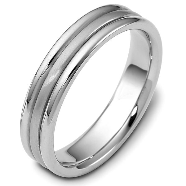 18 kt white gold, hand made comfort fit Wedding Band 5.0 mm wide. The center has a brush finish and the outer edges are polished. Different finishes may be selected or specified.
