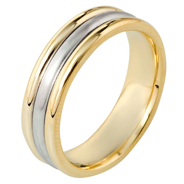 18 kt two-tone hand made comfort fit Wedding Band 6.5 mm wide. The center has a brush finish and the outer edges are polished. Different finishes may be selected or specified.