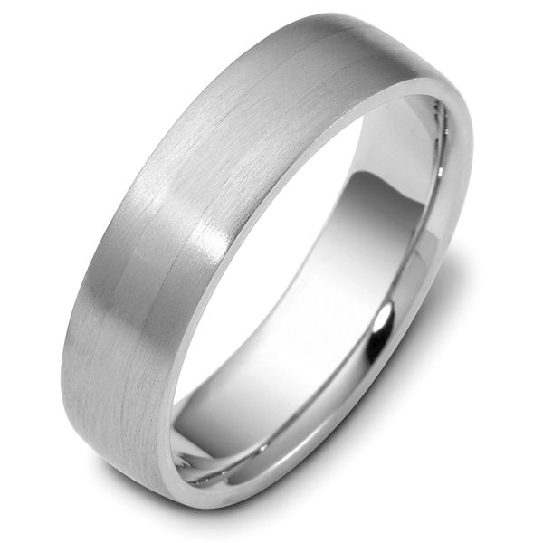14 kt white gold, hand made comfort fit Wedding Band 6.0 mm wide. Sides are Brushed center part is Matte. Different finishes may be selected or specifed.