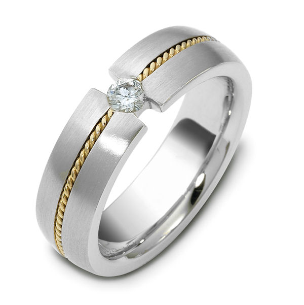 18K hand made, two-tone,6.0 mm wide, comfort fit, diamond ring, 0.12 ct diamond VS1 in clarity G in Color. There is one hand crafted rope in the center around the whole band. The band has a brush finish. Different finishes may be selected or specified.