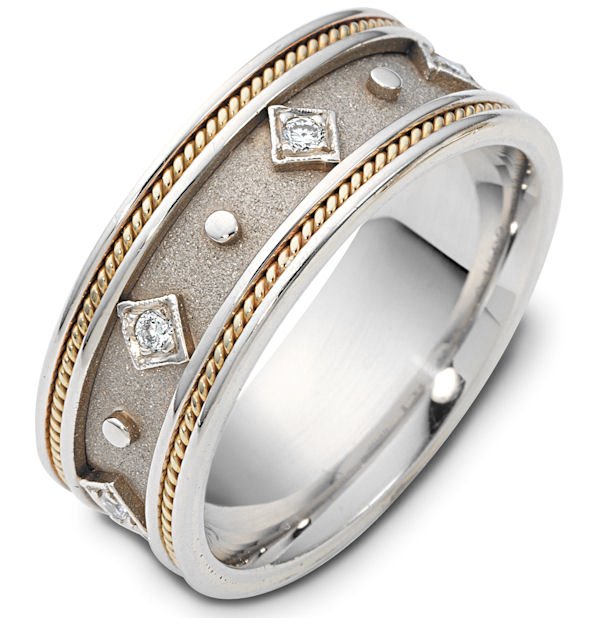 14K two-tone, 8.5 mm wide, diamond ring. 0.15 ct diamond weight in size 6.0. The center of the ring is a coarse and heavy sandblast finish. There is one hand made rope on each side of the band. The outer edges are polished. Different finishes may be selected or specified.