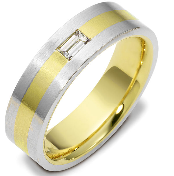 14 K hand made, 6.5 mm wide, comfort fit diamond wedding band. 0.20 ct diamond VS1 in Clarity G in Color. The whole ring is a brush finish. Different finishes may be selected or specified.