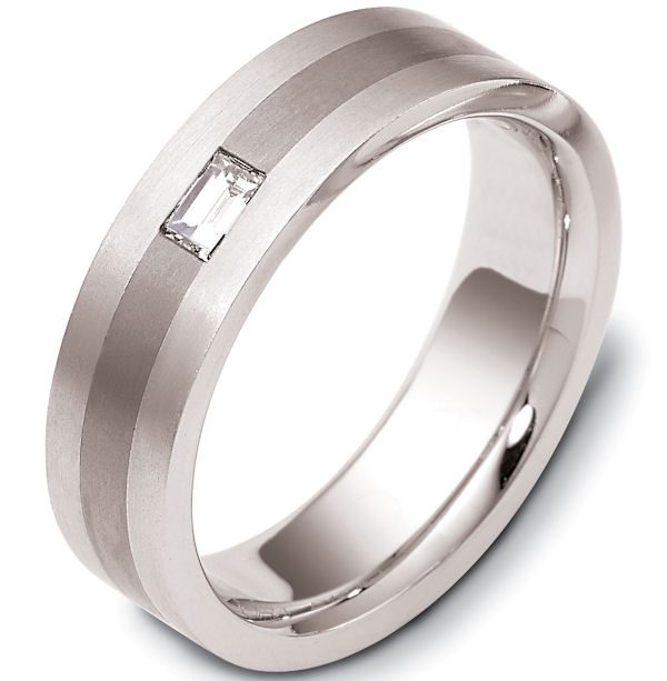 14 kt white gold and titanium, comfort fit Wedding Band 6.5 mm wide. 0.20 ct diamond VS1 in clarity G in color. The whole ring is a brush finish. Different finishes may be selected or specified.