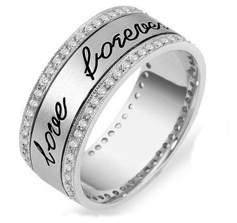 14K platinum, 8.5mm wde, comfort fit diamond eternity ring. The center can be engraved. Diamond total weight is approximately 1.90ct in size 6.0ring. Diamonds are graded as VS1-2 in clarity, G-H in color.