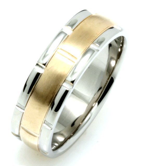 14 kt two-tone hand made comfort fit Wedding Band 7.0 mm wide. The center is a brush finish and the outer edges are polished. Different finishes may be selected or specified.