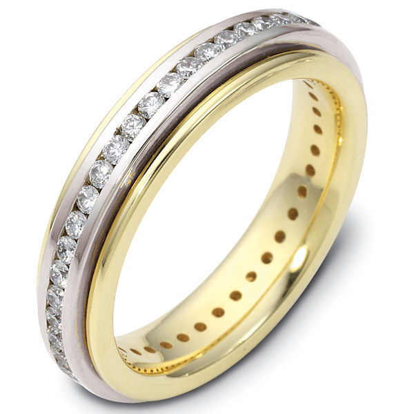 Platinum and 18K yellow gold, comfort fit, 5.0 mm wide. eternity rotating band. Diamond total weight is approximately 1.0 ct. Diamond total weight is estimated for a size 6.0 ring. The diamonds are graded as VS1 in Clarity G in Color. The whole ring is polished. Different finishes may be selected or specified.