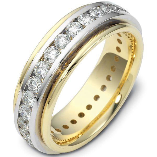 14K yellow gold, comfort fit, 6.0 mm wide, eternity band. Each diamond is 3.0 mm in diameter and diamond total weight is approximately 2.40 ct. Diamond total weight is estimated for a size 6.0 ring. The diamonds are graded as VS1 in Clarity G in Color. The whole ring is polished. Different finishes may be selected or specified.