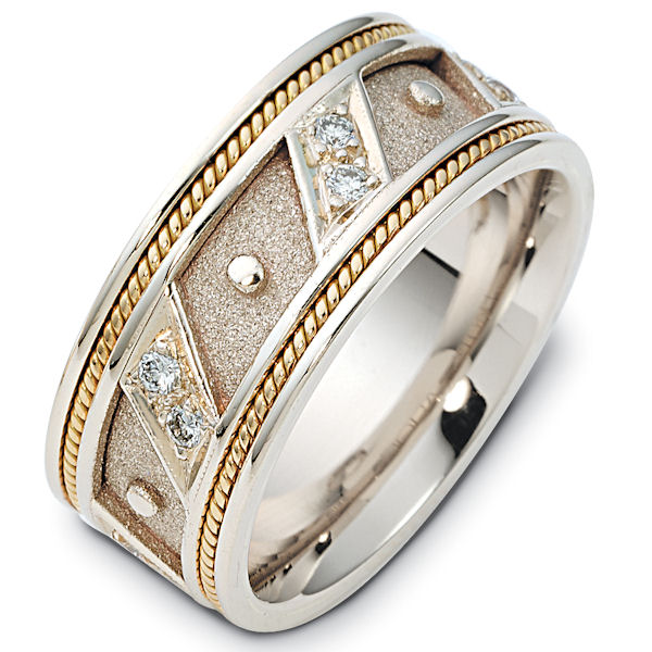 8.5 mm wide two-tone, diamond ring. 0.30 ct diamond weight in size 6.0. The center of the ring is a coarse and heavy sandblast finish. There is one handcrafted rope on each side of the band. The outer edges are polished. Different finishes may be selected or specified.