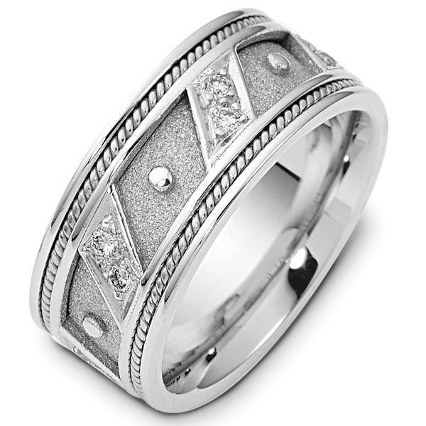 8.5 mm wide white gold, diamond ring. 0.30 ct diamond weight in size 6.0. The center of the ring is a coarse and heavy sandblast finish. There is one handcrafted rope on each side of the band. The outer edges are polished. Different finishes may be selected or specified.