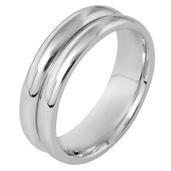 14 kt white gold, hand made comfort fit Wedding Band 7.0 mm wide. The ring is a polished finish. Different finishes may be selected or specified.