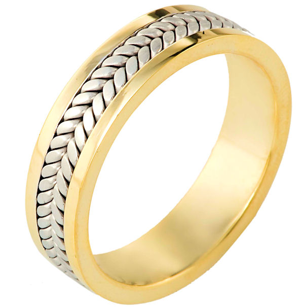 18 kt two-tone hand made comfort fit Wedding Band 5.5 mm wide. The center of the ring is a brush finish and the outer edges are polished. Different finishes may be selected or specified.