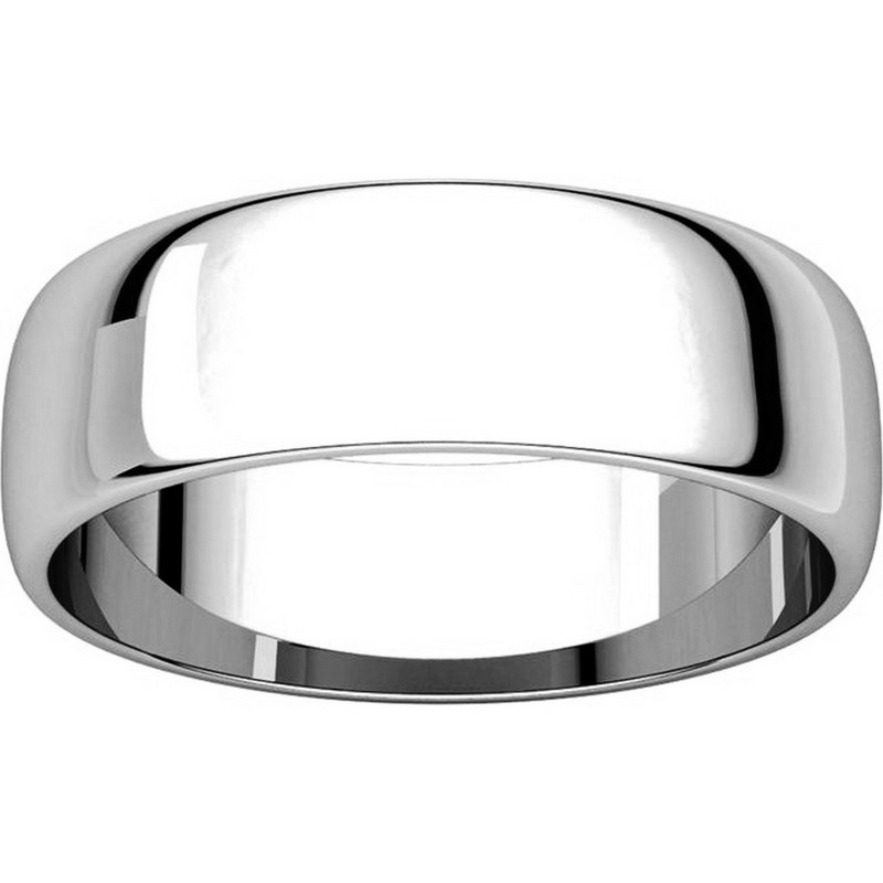 Platinum Plain 6.0 mm Wide Half Round Wedding Band. The whole ring is a polished finish. Different finishes may be selected or specified.