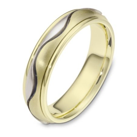 14 kt two-tone hand made comfort fit Wedding Band 6.0 mm wide. There is one carved curvy line in the center. It is a matte finish in the center and polished finish on the outer edges. Different finishes may be selected or specified.