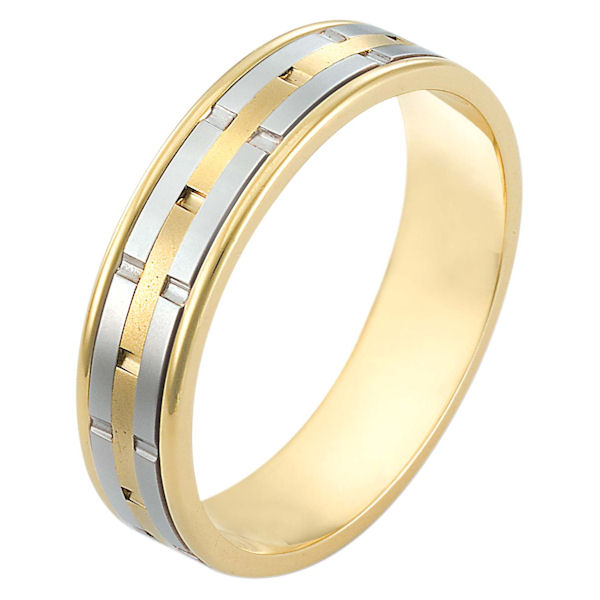 14 kt two-tone hand made comfort fit Wedding Band 5.0 mm wide. There are carved notches around the whole band. The center of the ring is a matte finish and the outer edges are polished. Different finishes may be selected or specified.