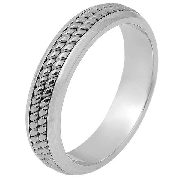 18 kt white gold, hand made comfort fit Wedding Band 5.0 mm wide. There are two hand made ropes in the center. The whole ring is a polished finish. Different finishes may be selected or specified.