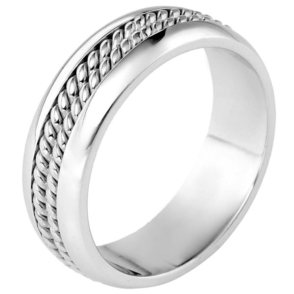 14 kt white gold, hand made comfort fit Wedding Band 7.0 mm wide. There are two hand made ropes in the center. The whole ring is a polished finish. Different finishes may be selected or specified.