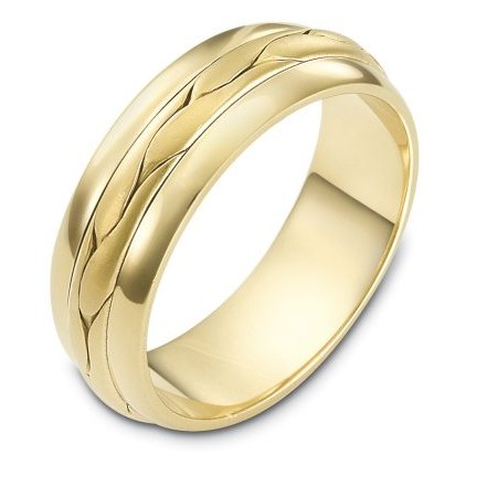 18 kt yellow gold hand made comfort fit Wedding Band 7.0 mm wide. The braid in the center is handcrafted and is a brush finish. The outer edges are polished. Different finishes may be selected or specified.