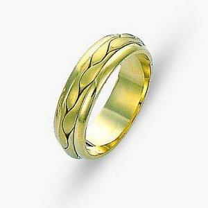 14 kt hand made comfort fit Wedding Band 6.0 mm wide. The braid in the center is hand crafted and is a matte finish. The outer edges are polished. Different finishes may be selected or specified.