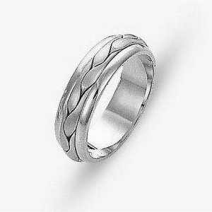 Platinum hand made comfort fit Wedding Band 6.0 mm wide. The braid in the center is hand crafted and is a matte finish. The outer edges are polished. Different finishes may be selected or specified.