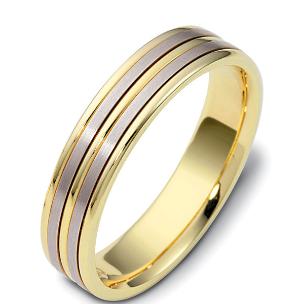 18 kt two-tone hand made comfort fit Wedding Band 5.0 mm wide. The two flat pieces in the center are matte finish and the rest is polished. Different finishes may be selected or specified.