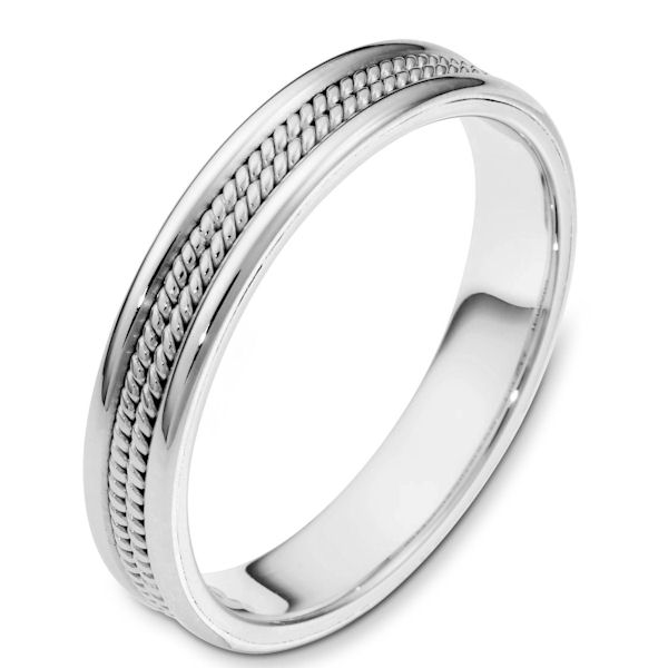 14 kt white gold, hand made Wedding Band 4.0 mm wide. There two hand made ropes in the center.The whole ring is a polished finish. Different finishes may be selected or specified.