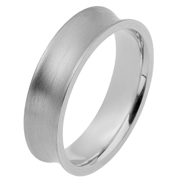 18K white gold, 6.0 mm wide, comfort fit wedding band. The ring is curved inward with a matte finish. Different finishes may be selected or specified.