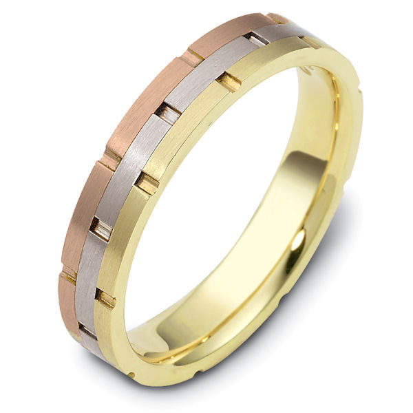 14K tri-color, hand made comfort fit wedding band 4.0 mm wide. The ring has carved notches around the band and is a matte finish. Different finishes may be selected or specified.