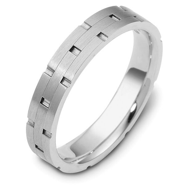 14kt white gold, hand made comfort fit wedding band 4.0 mm wide. The ring has carved notches around the band and is a matte finish. Different finishes may be selected or specified.