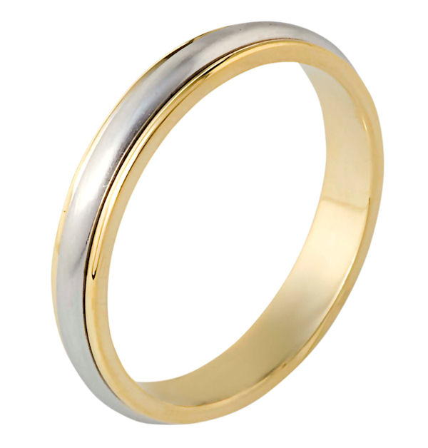 14 kt two-tone hand made comfort fit Wedding Band 4.0 mm wide. The center of the ring is a matte finish and the outer edges are polished.