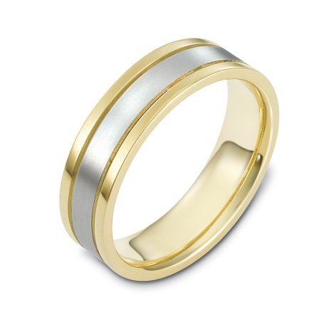 18 kt two-tone hand made comfort fit Wedding Band 6.0 mm wide. The center of the ring is a matte finish and the outer edges are polished.