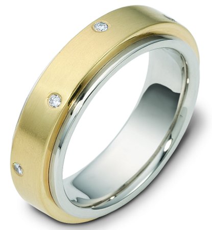 18 K gold center rotating, 9.0 mm wide diamond spinning wedding band. Diamond total weight is 0.40 ct in size six. Diamonds are graded as VS in clarity H in color. The center of the ring is spinning and is a matte finish. The outer edges are polished. Different finishes may be selected or specified.