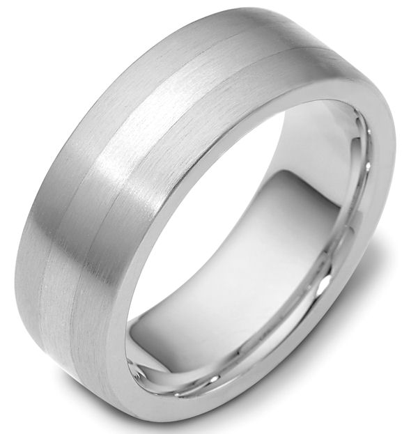 Platinum hand made comfort fit Wedding Band 7.5 mm wide. The ring is a brush finish. Different finishes may be selected or specified.