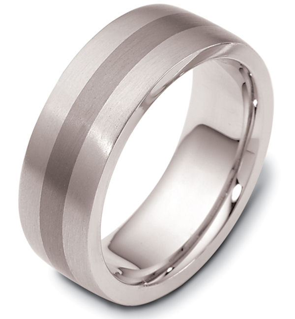 14 kt white gold and titanium, comfort fit Wedding Band 7.5 mm wide. The ring is a brush finish. Different finishes may be selected or specified.