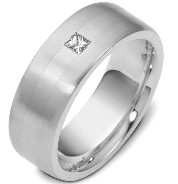 Platinum, 7.5 mm wide. comfort fit, diamond ring. Diamond is 0.13 ct and graded as VS1 in clarity G in color. The ring is a brush finish. Different finishes may be selected or specified.