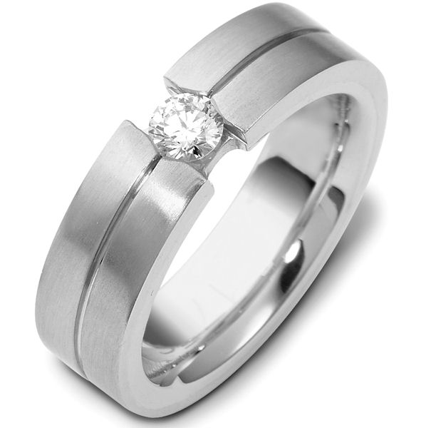 Palladium diamond, comfort fit, 6.0mm wide wedding band. The ring holds one round brilliant cut diamond that is 0.22 ct, VS1-2 in clarity and G-H in color. The ring has a matte finish. Different finishes may be selected.