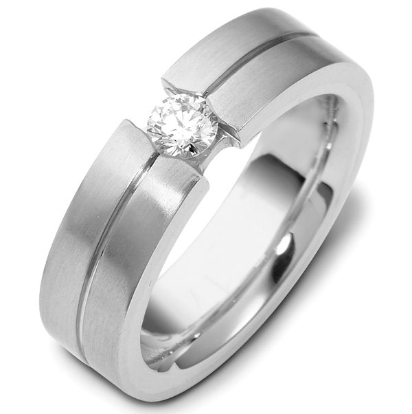 14kt White gold diamond, comfort fit, 6.0mm wide wedding band. The ring holds one round brilliant cut diamond that is 0.22 ct, VS1-2 in clarity and G-H in color. The ring has a matte finish. Different finishes may be selected.