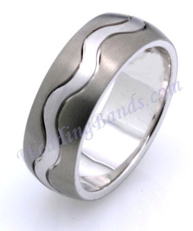 14K White gold and titanium, comfort fit, 8.5 mm wide ring. The ring is a brush finish. Different finishes may be selected or specified.