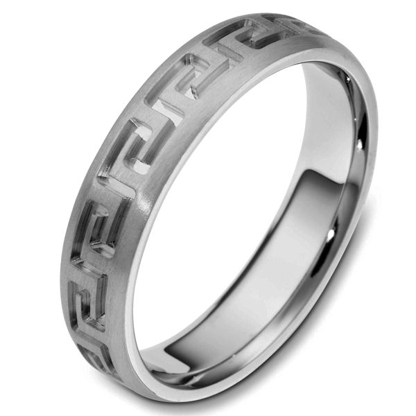 Titanium contemporary greek key, carved, comfort fit, 5.0mm wide wedding band. The ring has a beautiful greek key pattern around the whole band. It is a matte finish, 5.0mm wide, and comfort fit. The grooves are polished. Different finishes may be selected or specified.
