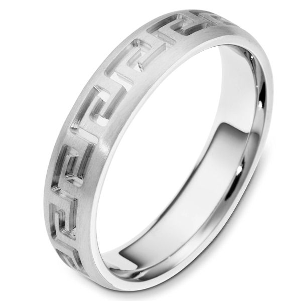 14kt White gold contemporary greek key, carved, comfort fit, 5.0mm wide wedding band. The ring has a beautiful greek key pattern around the whole band. It is a matte finish, 5.0mm wide, and comfort fit. The grooves are polished. Different finishes may be selected or specified.