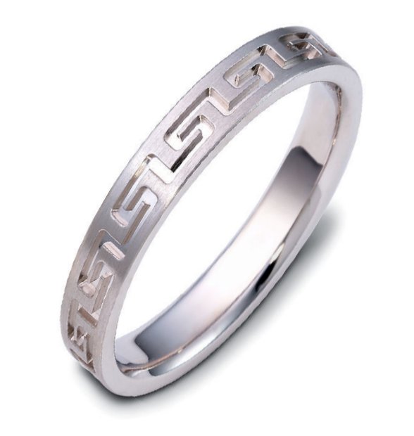 Platinum, contemporary greek key, carved, comfort fit, 4.0mm wide wedding band. The ring has a beautiful greek key pattern around the whole band. It is a matte finish, 5.0mm wide, and comfort fit. The grooves are polished. Different finishes may be selected or specified.